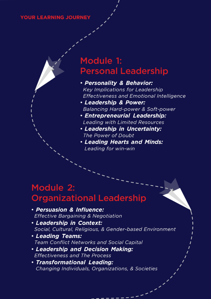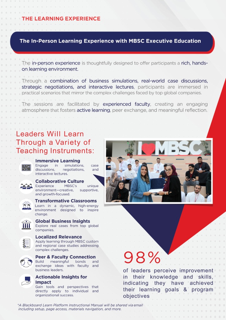 Leadership matters to everyone. Whether you are developing your own leadership skills now or aspiring to become a leader someday, learning what leadership is, how it is changing in the modern world, what is distinctive about it in the context of the Middle East and of the KSA, and how to acquire the mindset that allows your leadership capabilities to continue to expand and improve throughout your life are the goals of this flagship MBSC Advanced Leadership Program.